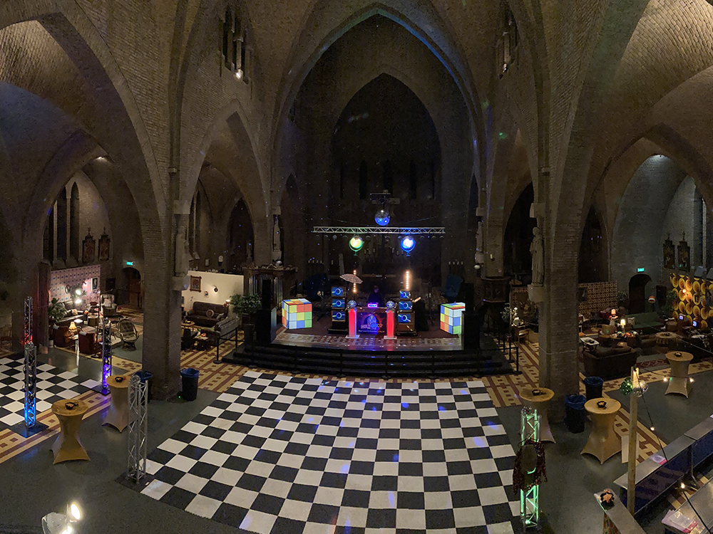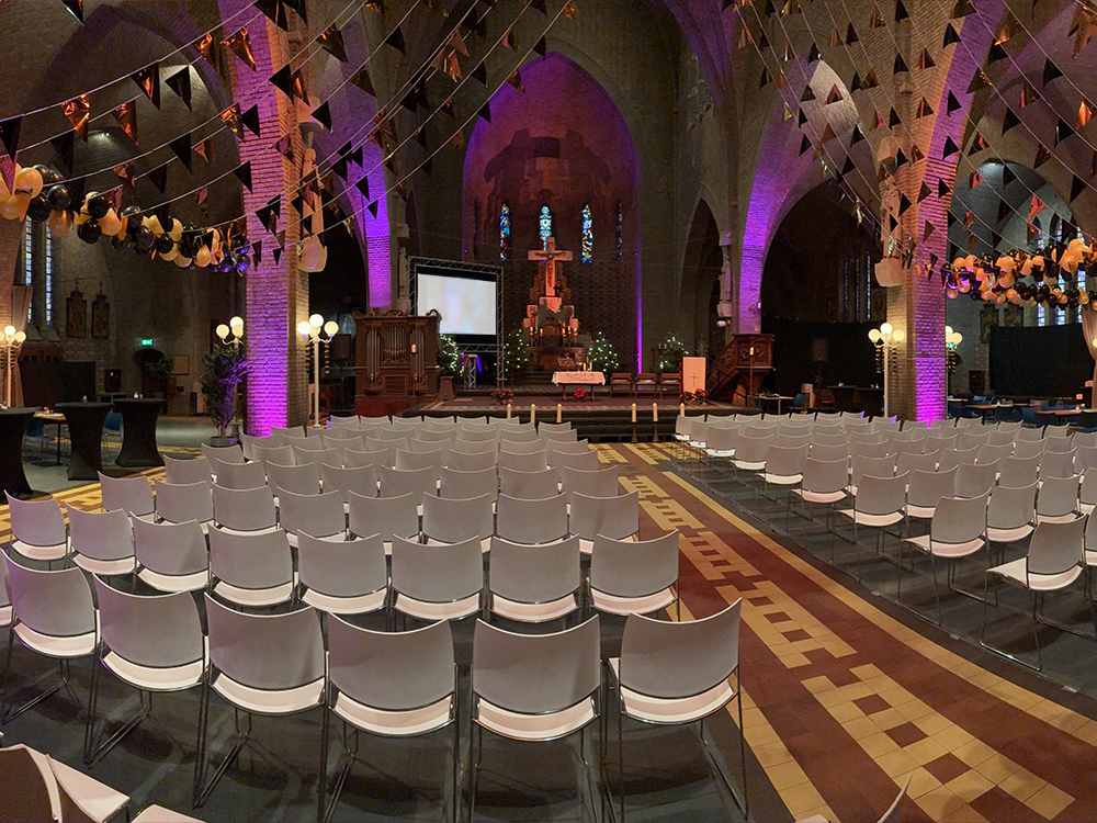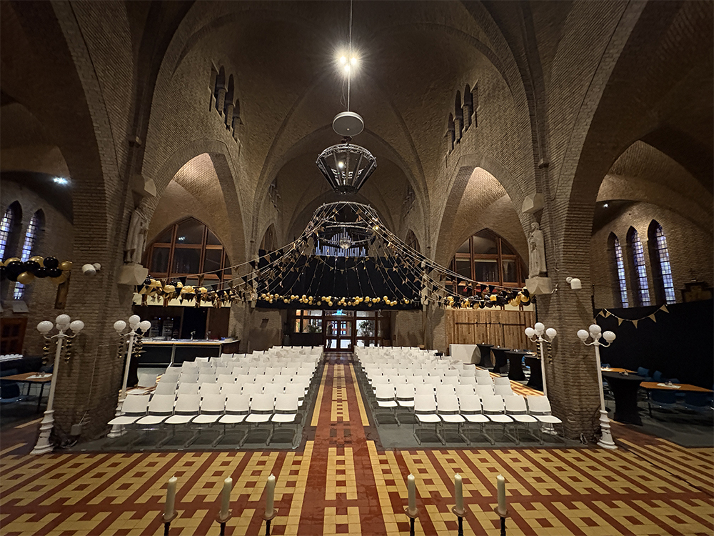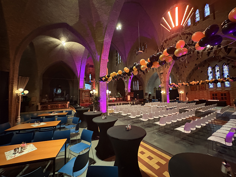 De grote zaal, genaamd “De Mauritiuszaal” is de oorspronkelijke kerkzaal. Het ademt nog altijd de sfeer van destijds. Een prachtige plek voor jouw feest, activiteit, bruiloft of afscheid van een dierbare. Uiteraard mag je de ruimte zelf nog verder aankleden en versieren naar wens, zodat deze helemaal aansluit bij jouw evenement! In de ruimte kun je maximaal 500 personen (zittend) of 800 personen (staand) ontvangen. Er zijn tafels en stoelen aanwezig waarmee eventueel een opstelling gemaakt kan worden.